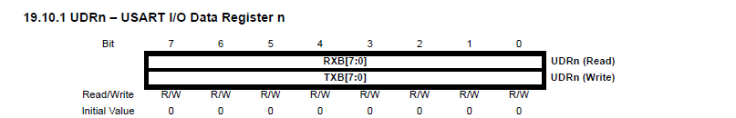 UDREn flag 가 set 되어 있을때 UDRn 레지스터에 데이터를 입력하고 ,transmit data buffer shift register 가 비어 있다면 ,데이터를 shift register 에 적는다 그리고 바로 TxDnb pin 으로 전송한다.