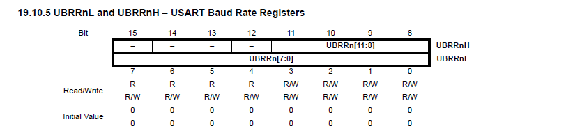 19.10.5 UBRRnL(0xC4) and UBRRnH(0xC5) – USART Baud Rate Registers