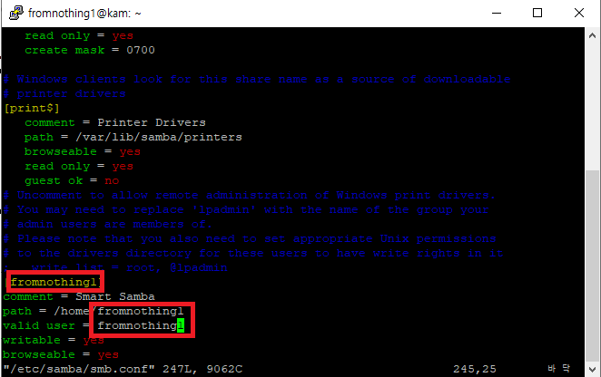 smb.conf 파일 제일 밑에다가 아래 txt글 추가 해준다.