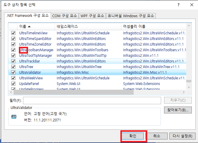 윈폼에서 도구상자 일반을 이름 바꾸기로 infragistics 로 바꾼다.