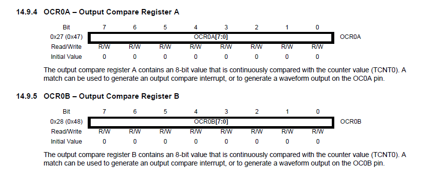 FOC0A,B : non PWM 모드에서 동작하며 , 1로 설정하는 즉시 강제로 OCn 단자에 출력비교 매치가 된것 과 같은 출력을 내보낸다. 특수한 상황이 아니면 0 이라고 생각하면 된다.