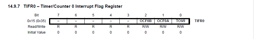 OCF0x : Timer/Counter compare match 인터럽트가 발생하면 1로 set , 인터럽트가 처리되기 시작하면 다시 0 으로 돌아간다.