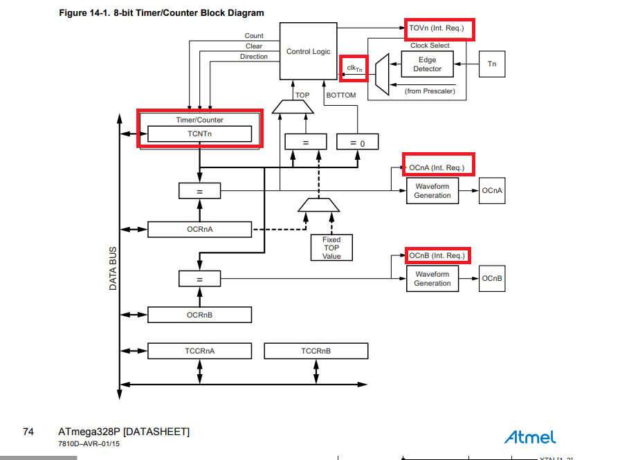 위의 다이아 그램을 보면 clk(Tn) 클럭이 들어가는 것을 알 수 있다. 이렇게 들어온 클럭을 TCNTn 에서 카운트 한다 .( 8bit 인경우 0 ~ 255 를 왔다리 갔다리 한다. )