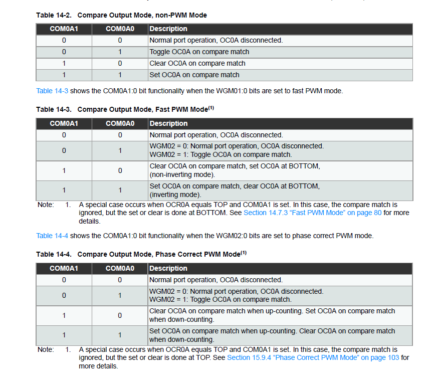 FOC0A,B : non PWM 모드에서 동작하며 , 1로 설정하는 즉시 강제로 OCn 단자에 출력비교 매치가 된것 과 같은 출력을 내보낸다. 특수한 상황이 아니면 0 이라고 생각하면 된다.