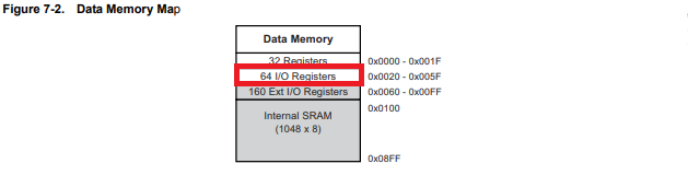 하지만 우리가 궁금한 0x0(0x20) 라 표현된 메모리 주소는 64 i/o register 부분이다. 이는 sram 안에 포함된 부분이다.