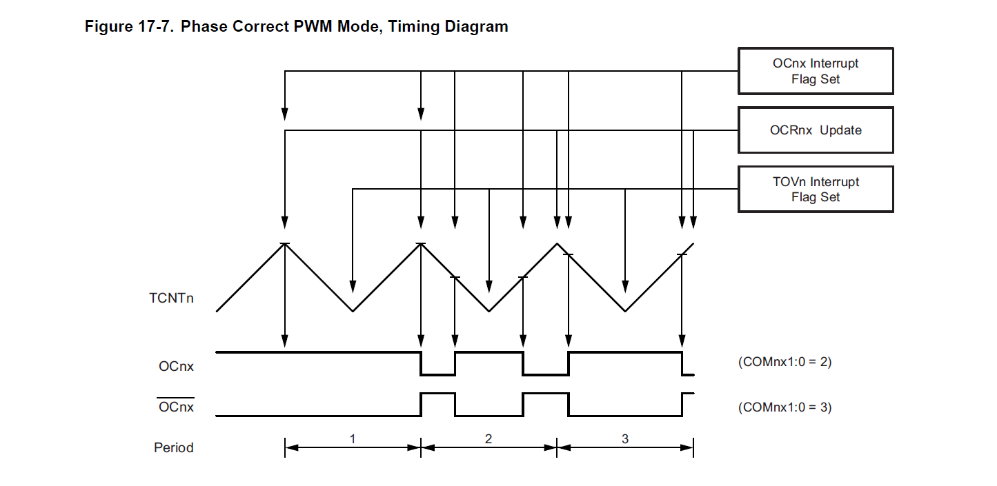 상승중 OCRx 값과 동일하게 된다면, OCnx 출력을 1로 set 하고 하강중 OCRx 값과 동일하다면 OCnx 출력을 0으로 set 한다.