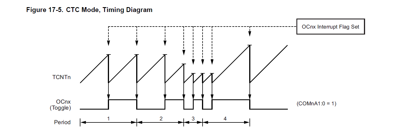 그림과 같이 TCNTn 값이 증가하다가 OCRx 값이 되면 0 으로 초기화 되면서 compare 인터럽트가 발생한다.