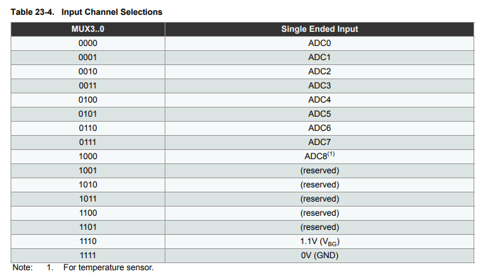 conversion 할 아날로그 input voltage 번위는 0 ~ AREF까지 이다. 설정에 따라서 AVcc 또는 1.1v 가 될 수도 있다.