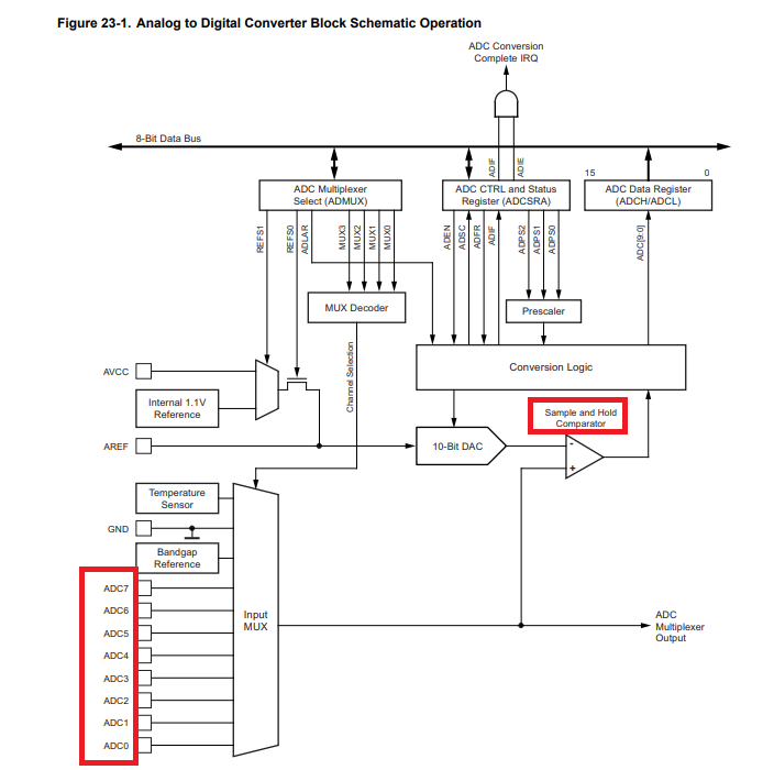 atmega328 의 경우 8 채널 10 bit 의 분해능을 가진 축차 비교형 ADC 이다.