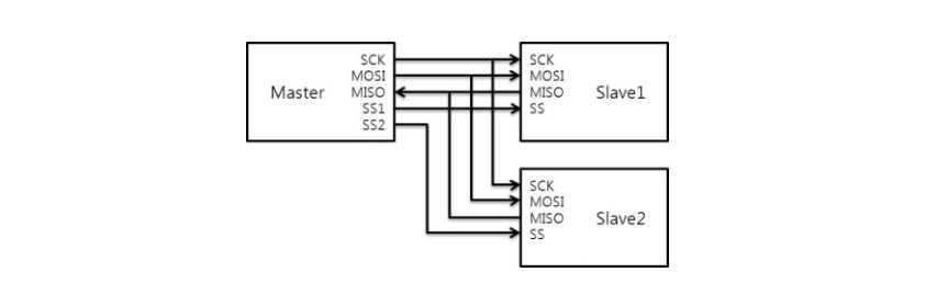 SPI 통신은 위와 같이 Master mode 와 Slave mode 가 존재하고 1대의 Master 가 여러대의 Slave 와 통신하는 구조이다. 어떤 Slave 와 통신 할지는 SS 선에 들어오는 신호를 감지하고 결정한다.