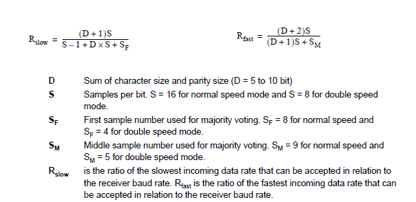 내부 클럭은 시스템 클럭을 분주비로 나누어서 사용하는데 데이터 시트에는 이에 따른 보드레이트 공식이 표로 나와있다.
