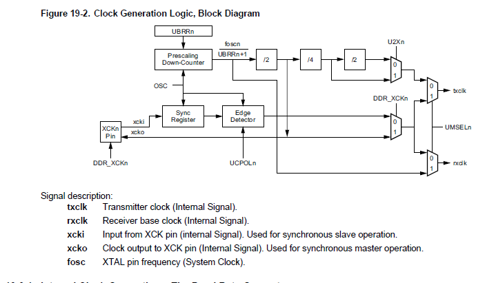 동기 모드에서만 Clock Generation 동작하는데 SLAVE 인지 MASTER 인지에 따라서 XCKn 핀의 방향을 조절 해야 한다.