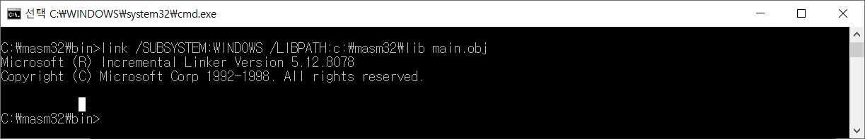 위의 코드를 main.asm 으로 저장한후 ml.exe 파일이 있는 폴더에 넣는고 실행한다.