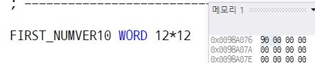 FIRST_NUMVER8 WORD 10 DUP(0ABCDh); 0ABCD 가 들어있는 10 개짜리 WORD 배열