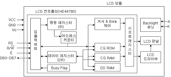 명령(Instruction)과 데이터(Data)를 위한 2개의 레지스터, BF(Busy Flag), AC(Address Counter), 문자발생램(CGRAM), 문자발생롬(CGROM), 데이터표시램(DDRAM)이 있습니다.