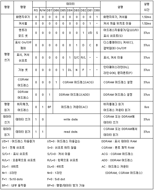 명령(Instruction)과 데이터(Data)를 위한 2개의 레지스터, BF(Busy Flag), AC(Address Counter), 문자발생램(CGRAM), 문자발생롬(CGROM), 데이터표시램(DDRAM)이 있습니다.