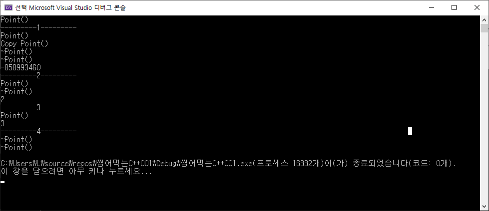 3. 함수에서 매개변수 보내고 , 값을 return 할때는 복사 생성(Point(const Point& p) { cout << "Copy Point()" << endl;})를 호출한다.