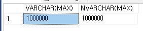 SELECT LEN(col1) AS [VARCHAR(MAX)], LEN(col2)AS [NVARCHAR(MAX)] FROM maxTbl;