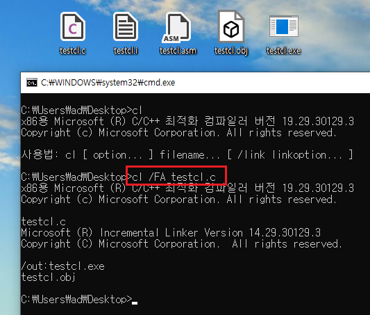 - /FAs : asm 확장자로 된 어셈블리어 파일을 만들겠다. 리버싱 공부할 때 편할듯ㅎ, ml 명령어 치고 link 명령어 쳐서 exe 파일도 만들 수 있다.
