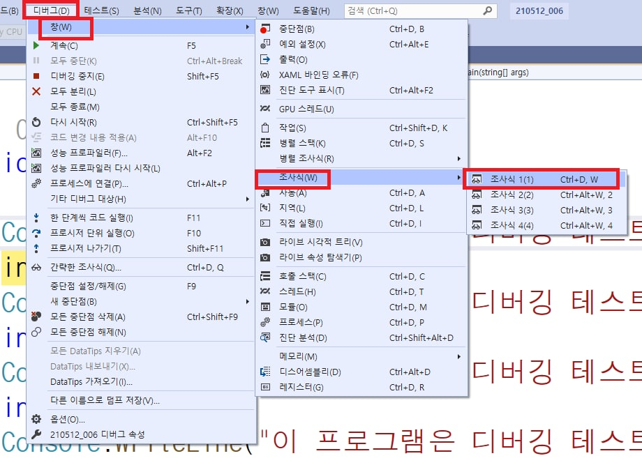 주의 * 디버깅 중에만 조사 식이 뜬다.