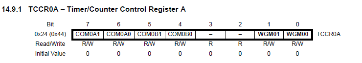 FOC0A,B : non PWM 모드에서 동작하며 , 1로 설정하는 즉시 강제로 OCn 단자에 출력비교 매치가 된것 과 같은 출력을 내보낸다. 특수한 상황이 아니면 0 이라고 생각하면 된다.