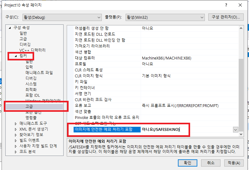 project 속성 -> 링커 -> 고급 -> 이미지에 안전한 예외 처리기 포함 아니요 선택