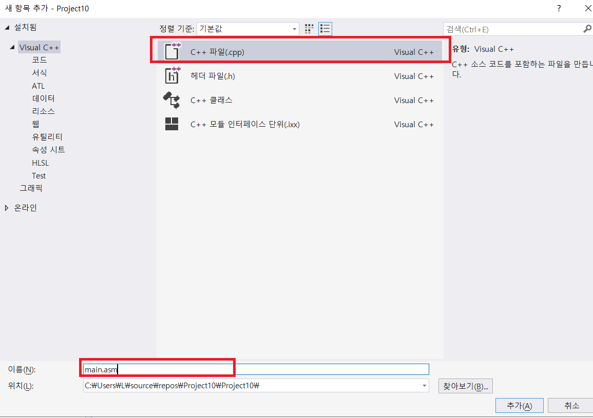 탐색기 , 내가 생선한 main.asm -> 속성 -> 항목 형식에서 microsoft macro assembler 선택
