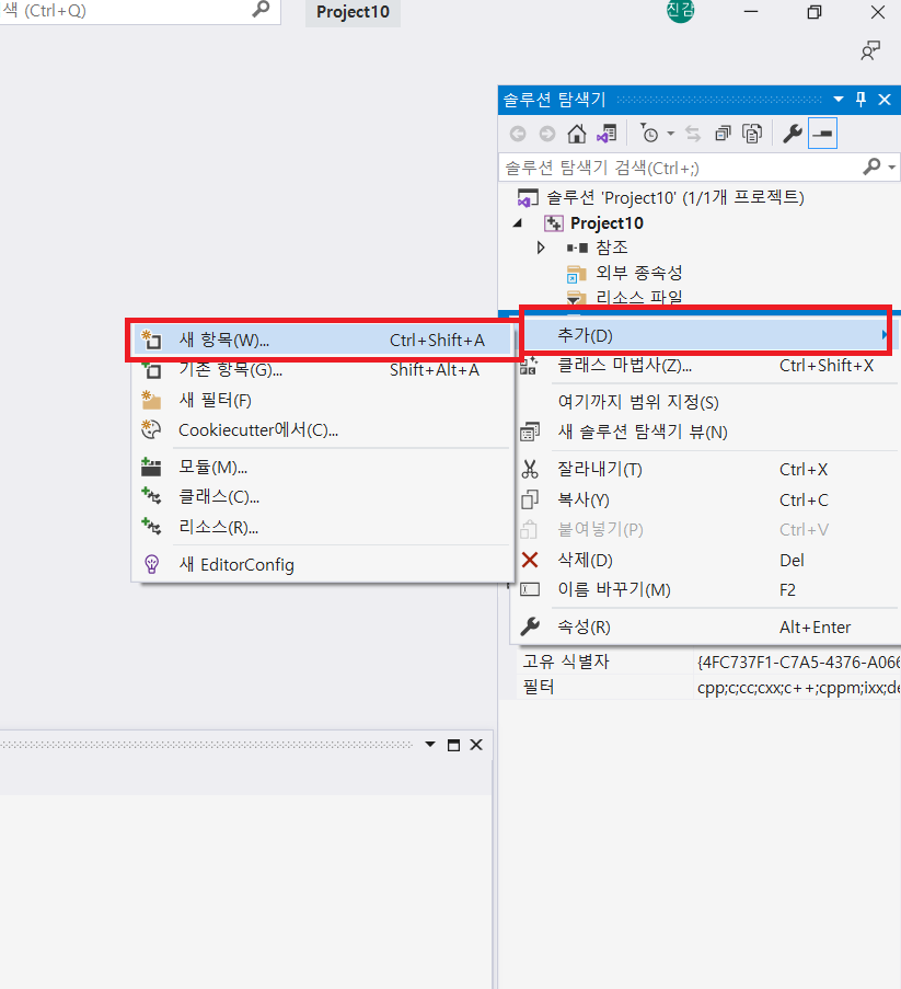솔루션 탐색기의 소스파일 ->추가 -> 새항목